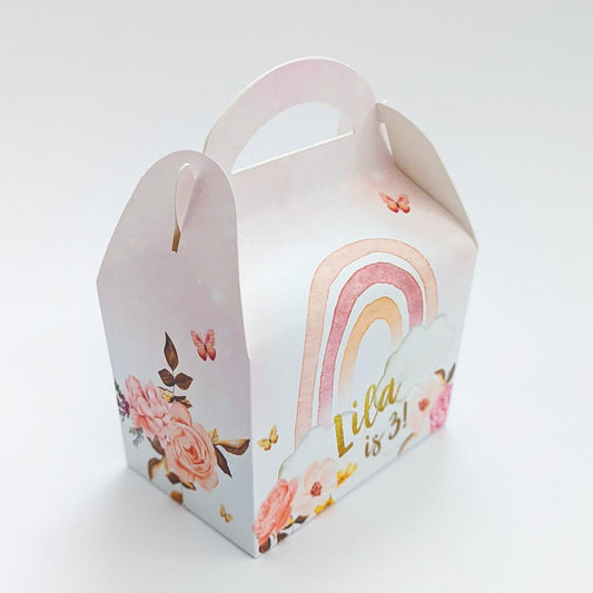 Pink floral boho rainbow Personalised Children’s Party Box Gift Bag Favour