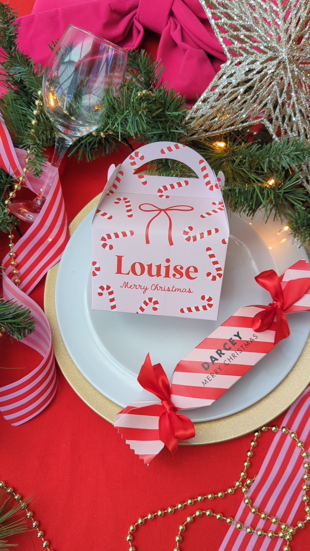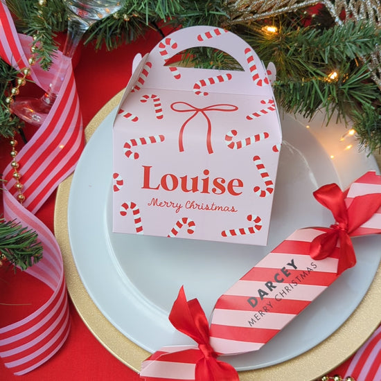Personalised Candy Stripe Christmas Cracker Pink Red Merry and Bright Treat Box