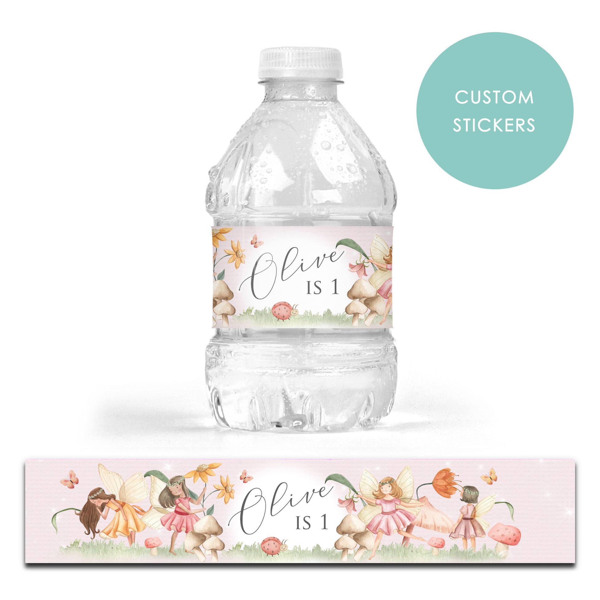 DRINK LABEL STICKERS x 7 Personalised Fairies Fairy Magical Woodland Party