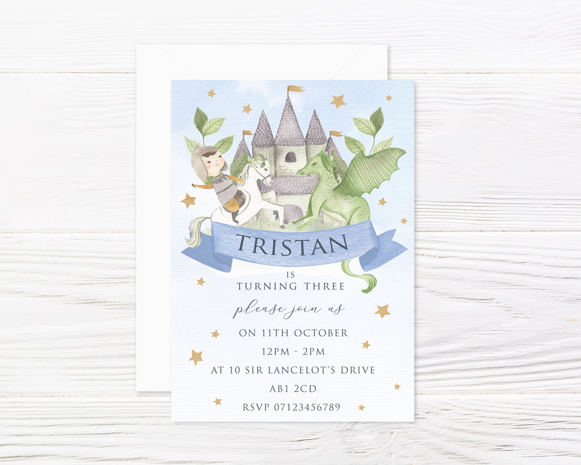 Personalised Knights and Dragons Party Invitations and Envelopes x 8