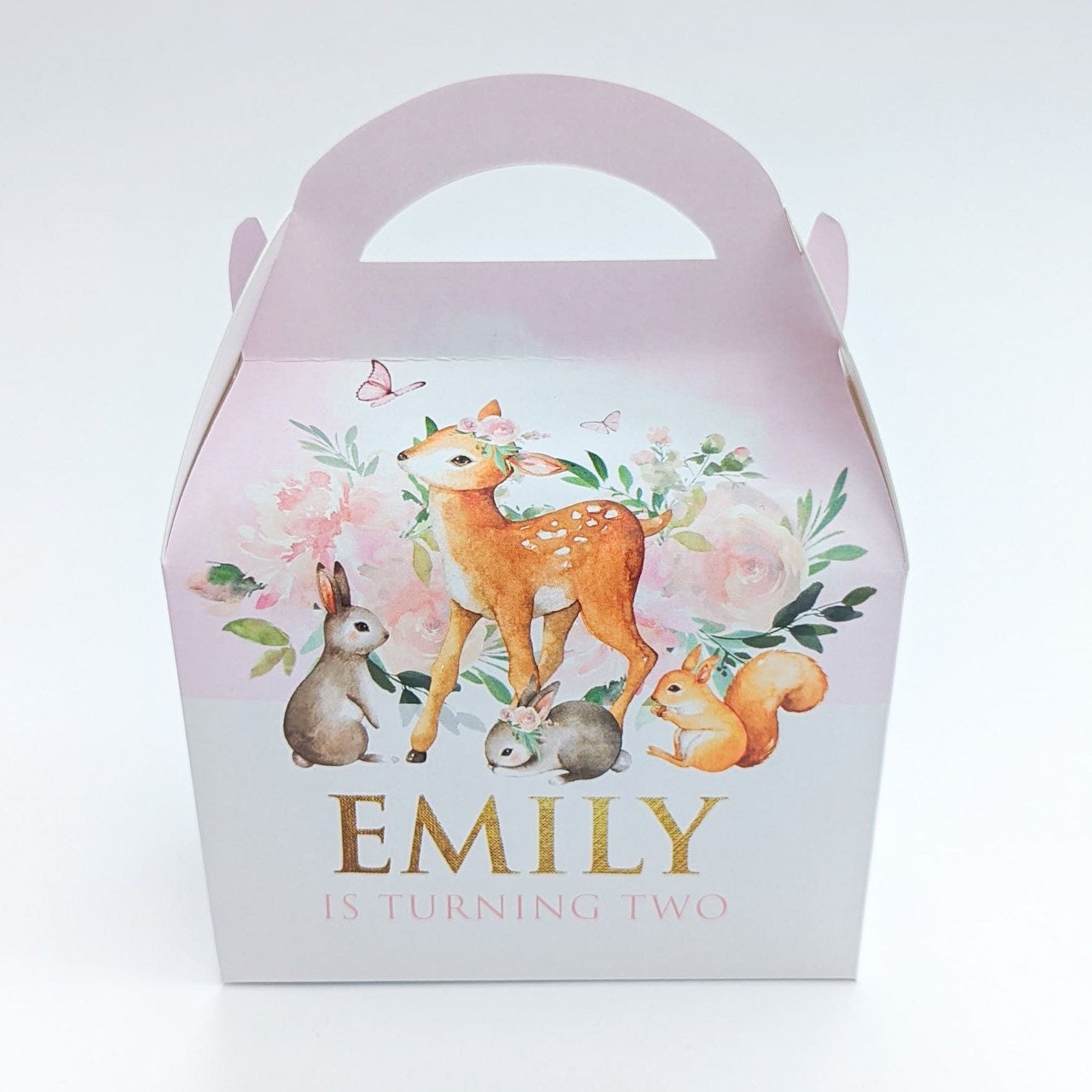 WOODLAND Forest Friends Floral animals Personalised Children’s Party Box Gift Bag Favour